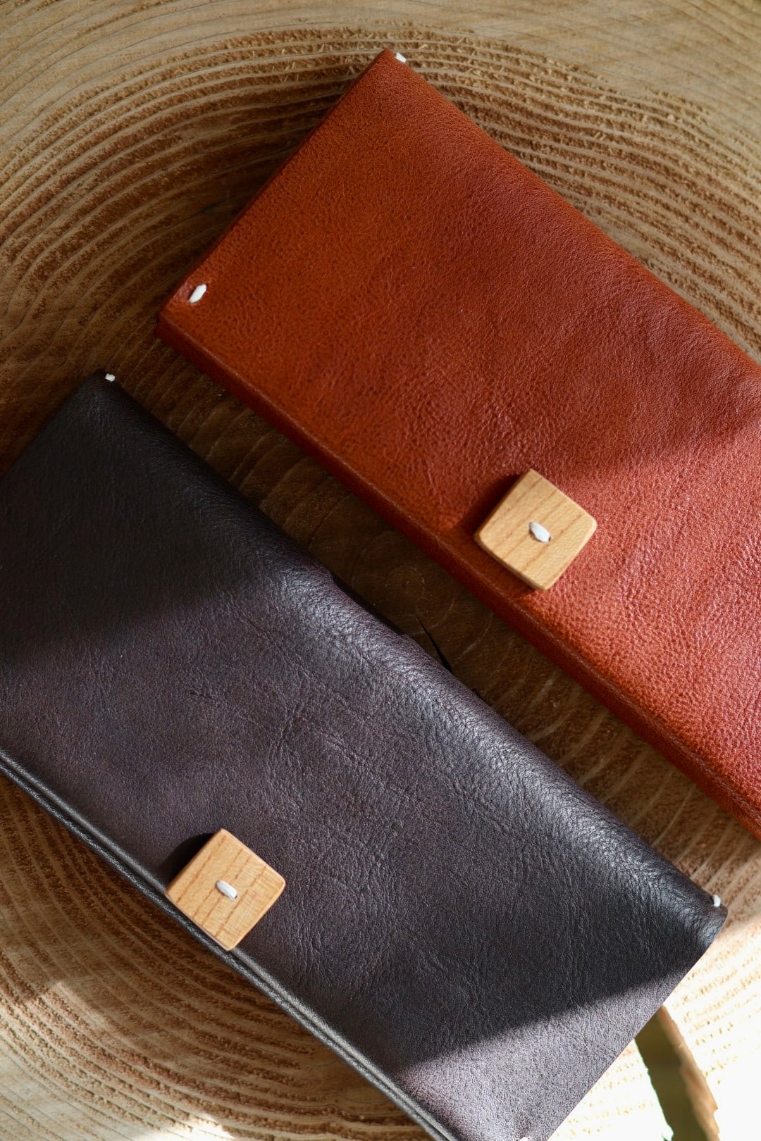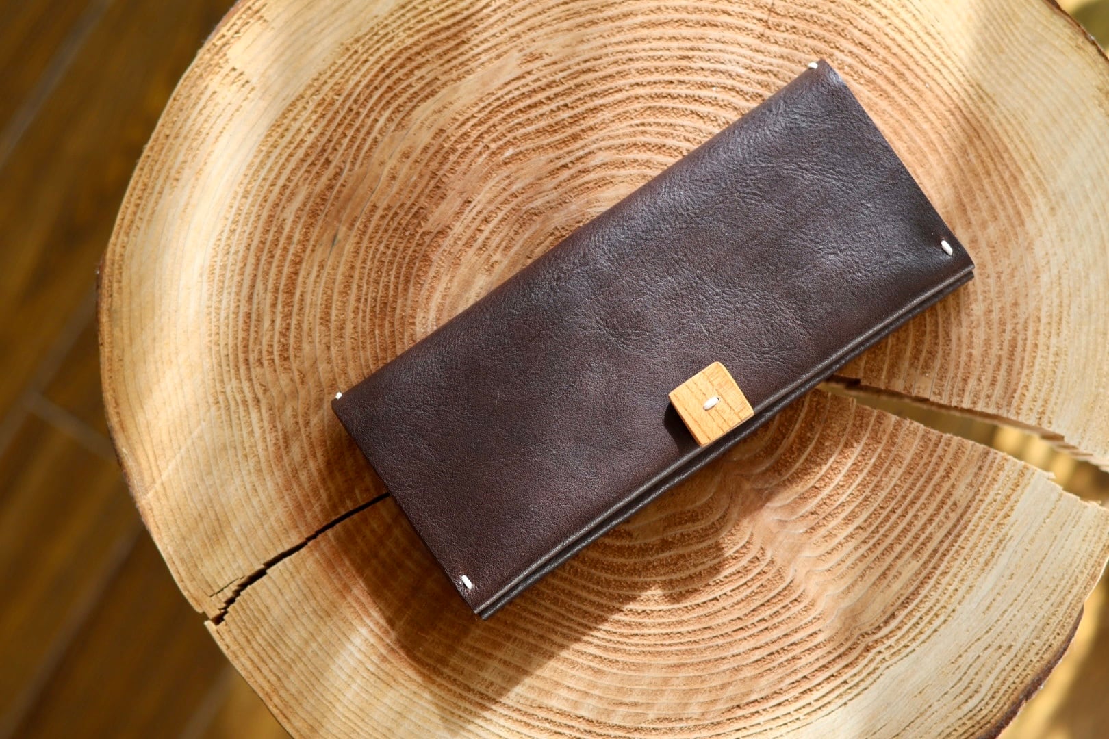 太糸を使用したスティッチと、欅の木を使ったハンドメイドのボタンがアクセントになっています。